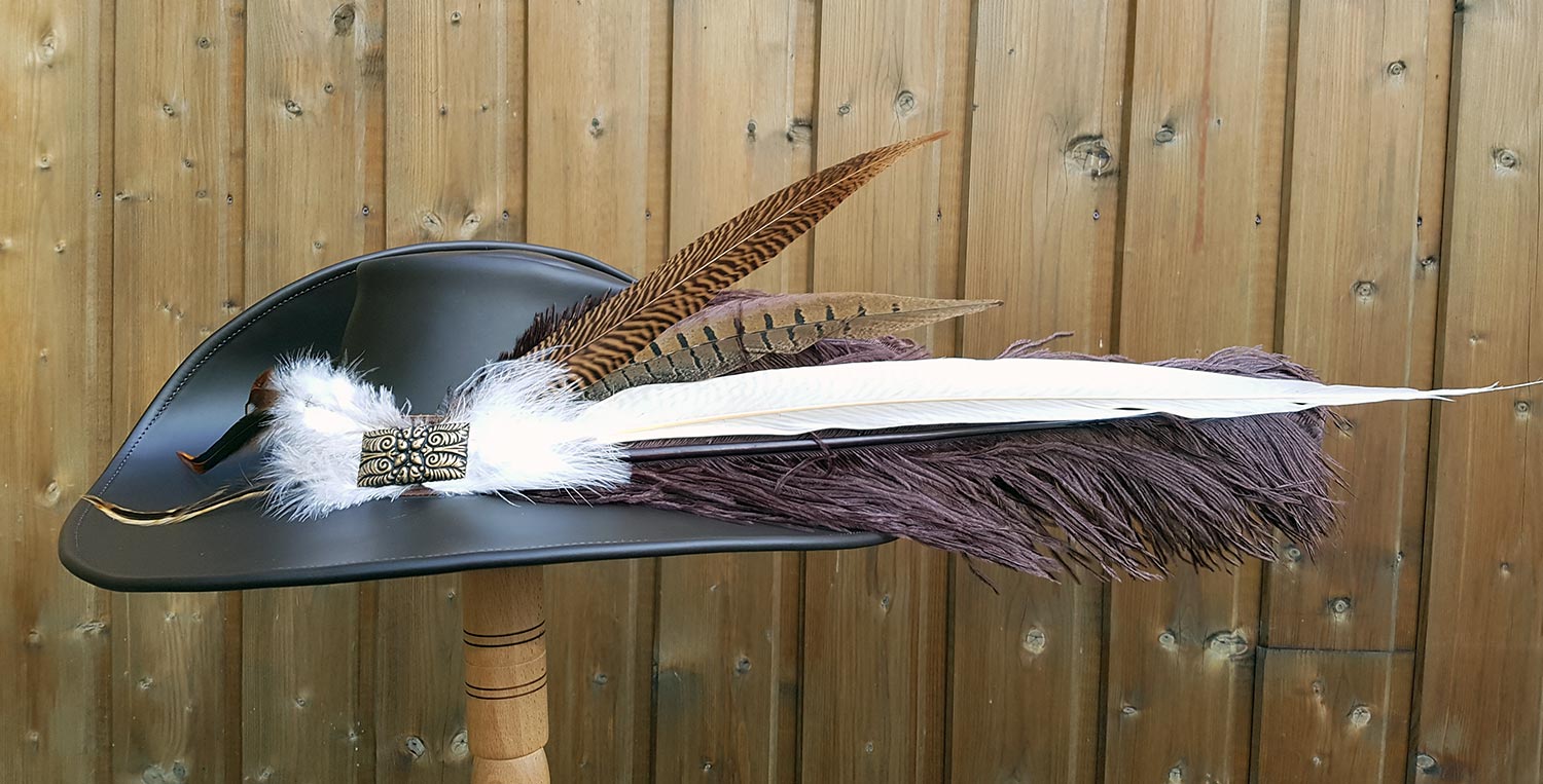 Chapeau style mousquetaire en cuir brun très foncé, avec bande-tour en cuir marron, plumes autruche, faisan et coq, médaillon et fleur de lys bronzes (180 euros) / Tour de tête 58 cm
