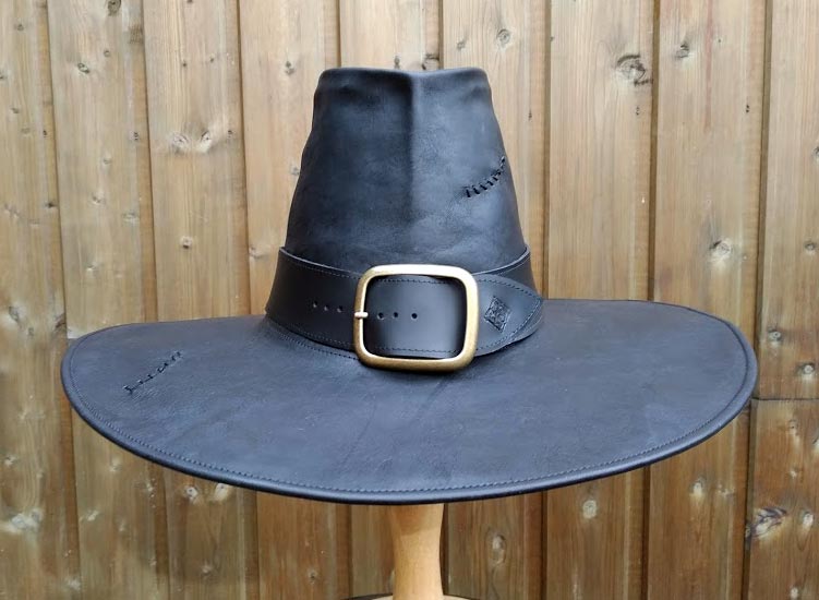 Chapeau répurgateur en cuir noir, avec coutures, bande-tour noire et boucle bronze (150 euros) / Tour de tête 60-61 cm Published octobre 21 Image Size: 751 × 550 Chapeau répurgateur en cuir noir, avec coutures, bande-tour noire et boucle bronze (150 euros) / Tour de tête 60-61 cm Previous Photo Next Photo
