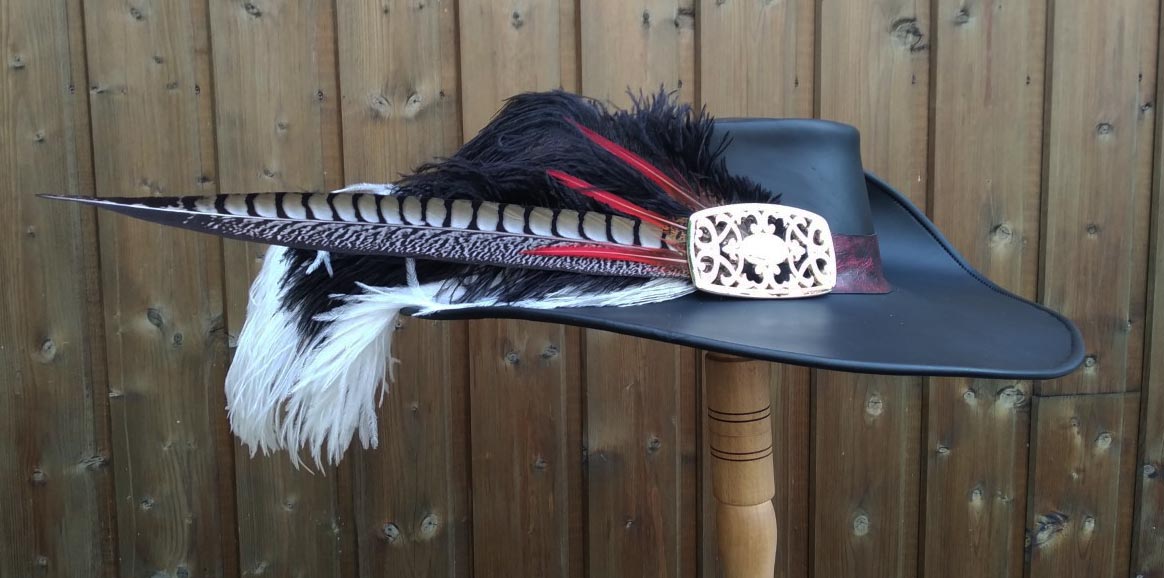 Chapeau style mousquetaire en cuir noir, avec bande-tour rouge brossée noir, médaillon doré, plumes autruche et faisan (180 euros) / Tour de tête 57 cm