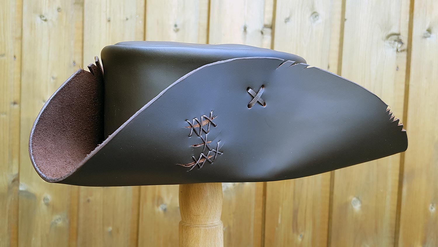 Tricorne en cuir brun très foncé, effet vieilli et recousu, avec laçages (105 euros) / Tour de tête 58 cm Published octobre 28 Image Size: 1500 × 848 Previous Photo Next Photo