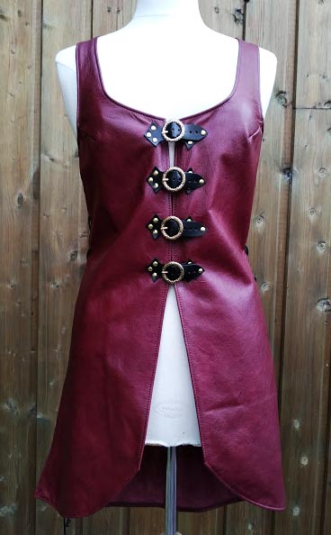 Tunique en cuir de vachette lisse bordeaux, fermeture par boucles dorées devant et laçages sur les flancs (170 euros) / Taille M-L Published octobre 21 Image Size: 368 × 594 Tunique en cuir de vachette lisse bordeaux, fermeture par boucles dorées devant et laçages sur les flancs (170 euros) / Taille M-L Previous Photo Next Photo