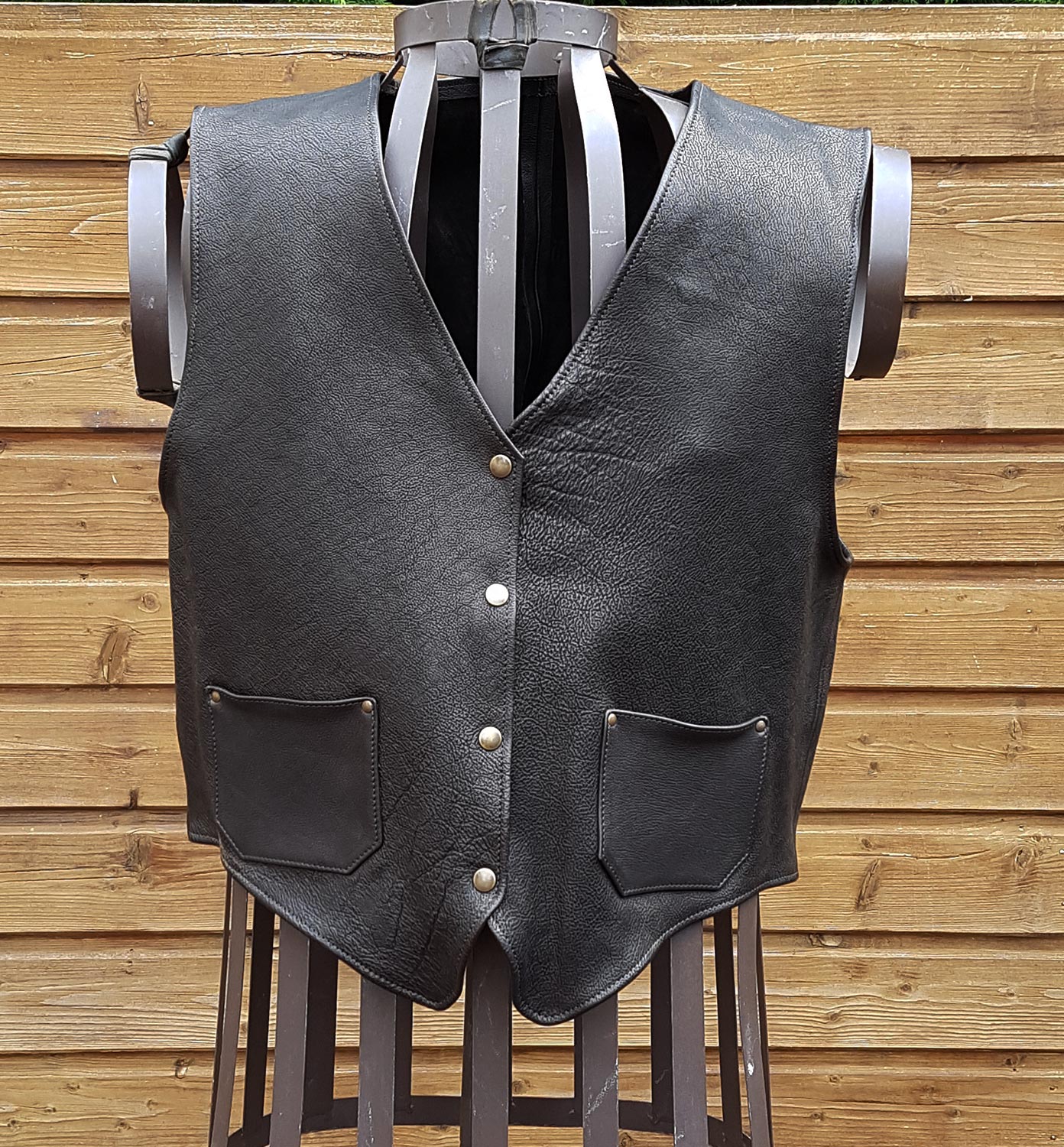 Boléro en cuir de vachette noir grainé, poches intérieures et extérieures, boutons pression bronzes (135 euros) / Taille L