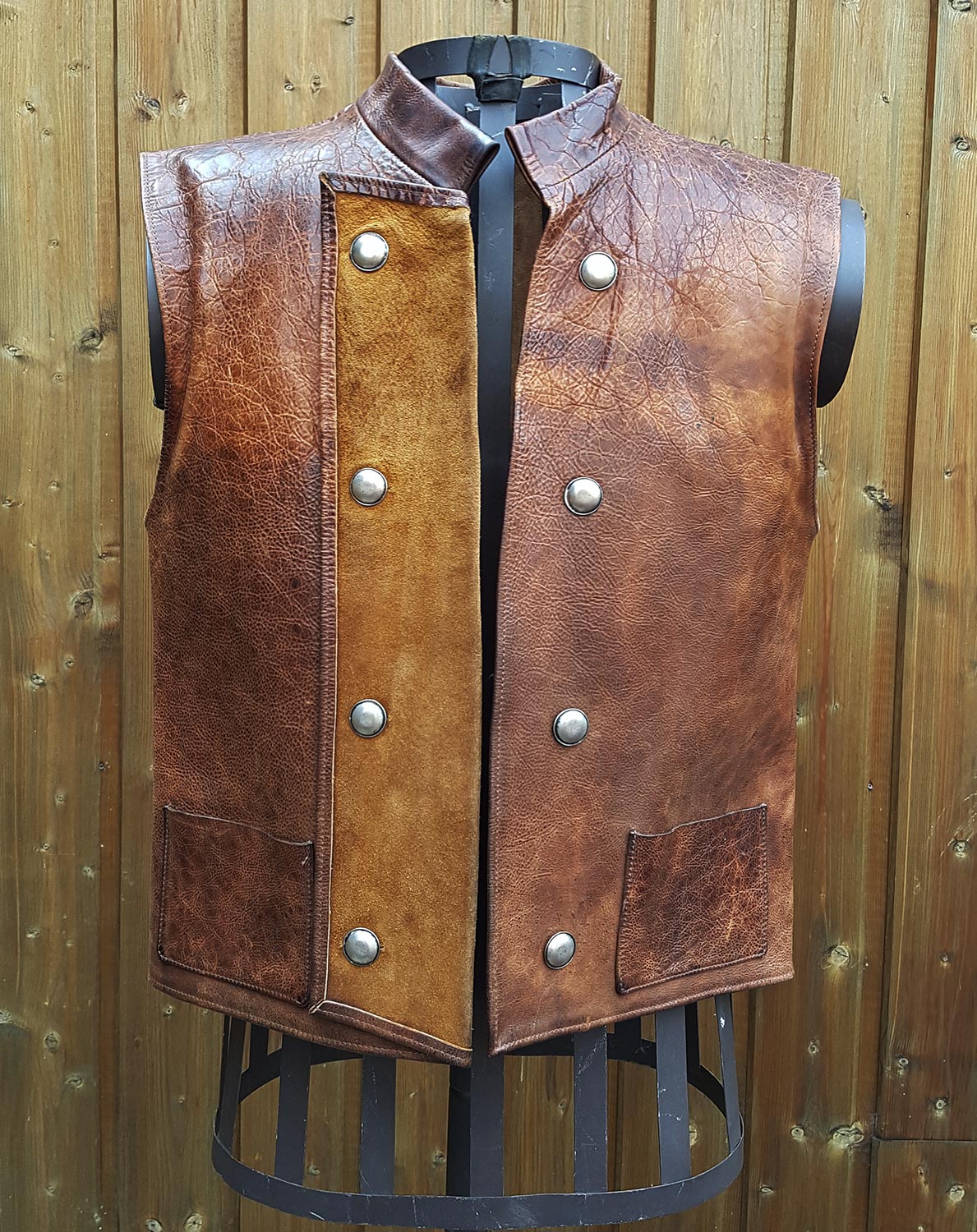 Gilet en cuir marron effet vieilli, avec col mao, poches intérieures et extérieures, revers et boutons argentés (OCCASION 100 euros) / Taille L Published août 12 Image Size: 1189 × 1500 Gilet en cuir marron effet vieilli, avec col mao, poches intérieures et extérieures, revers et boutons argentés (OCCASION 100 euros) / Taille L Previous Photo Next Photo